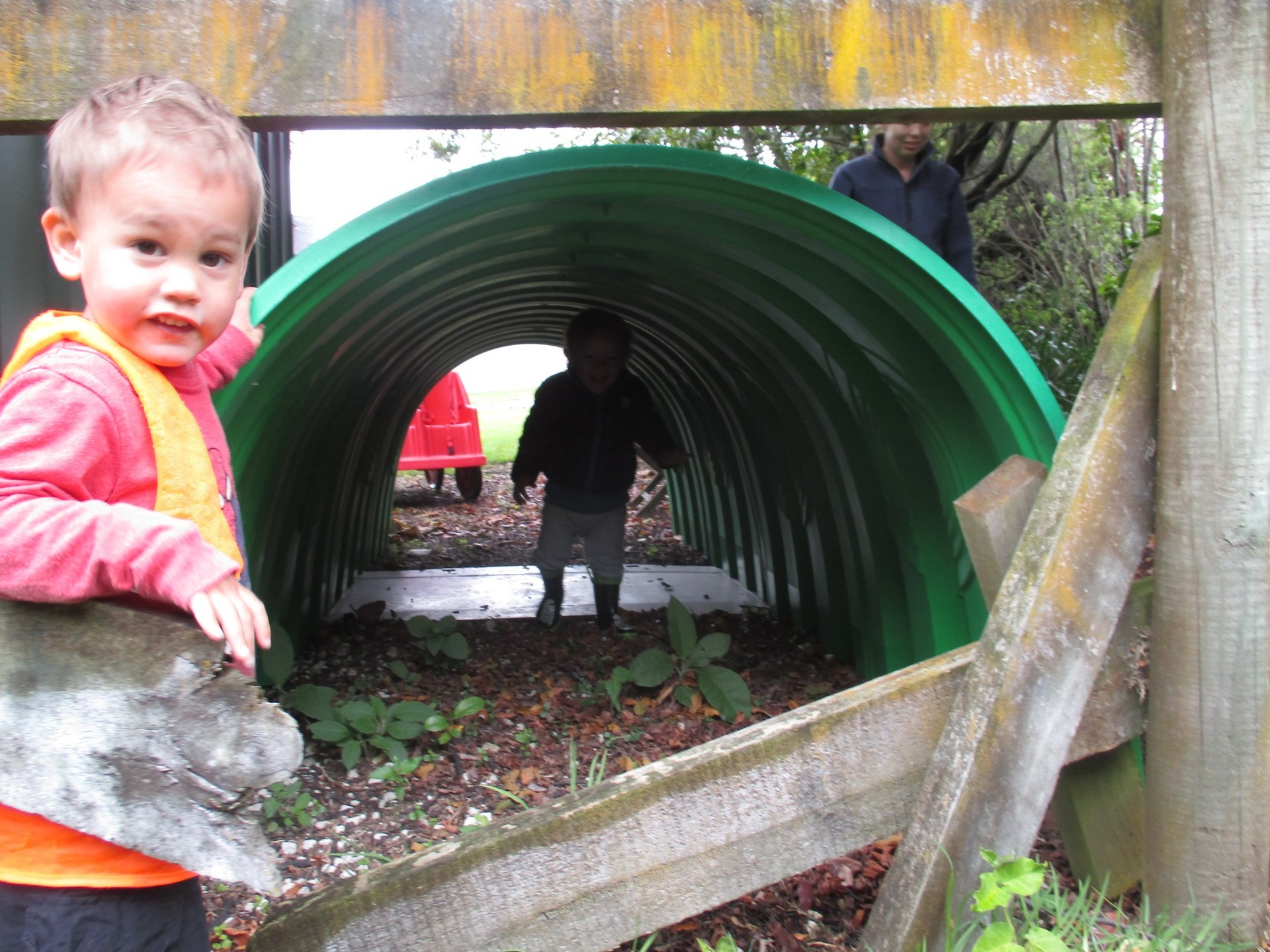 We went up to the end of the driveway and had a look at all the houses and lovely gardens. On the way back one of the boys said “Oh Percy’s tunnel”. There was a green tunnel sitting on the side of the driveway that looked just like the tunnel from Thomas the Tank Engine. We decided it would be fun to explore the tunnel so we got out of the buggy and looked through the tunnel then walked to the end.